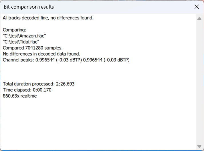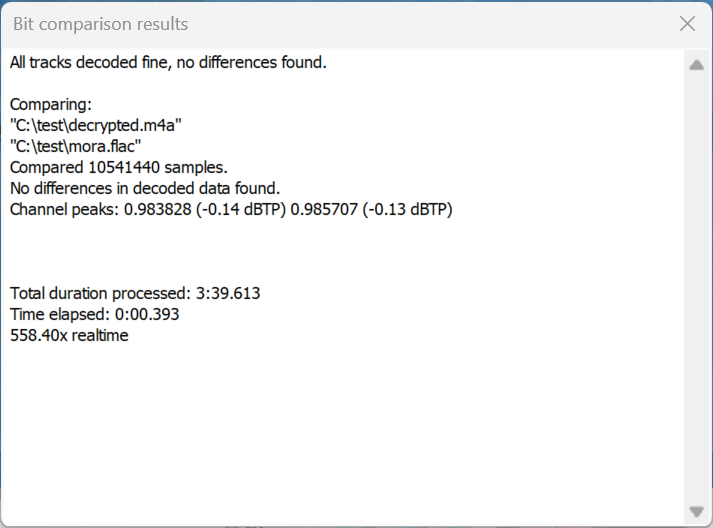 在进行后续对比之前,我们必须首先确保录音能够精确还原 Apple Music 输出的原始音频流。我们可以使用 foobar2000 的 Binary Comparator 组件(下称 bitcompare)来进行对比,你可以在 foobar2000 的组件库 中找到它并安装,请注意一下这个组件只有 32 位格式。 此处,我们手里有三份音源,一份是通过工具下载解密 DRM 获得的 ALAC(decrypted.m4a),一份是内录的 WAV(recorded.wav),另一份是通过 MORA 自购下载的无损 FLAC(mora.flac)。