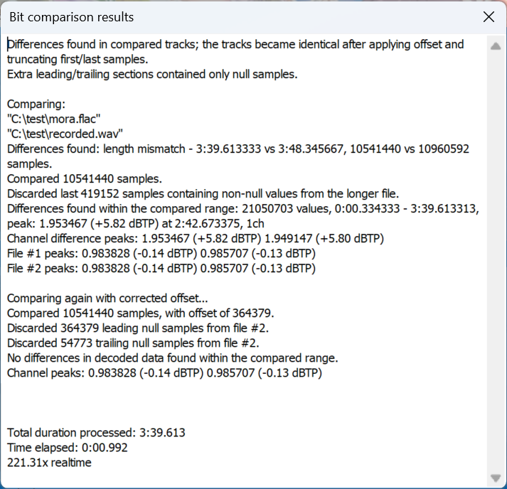 注意到 bitcompare 的提示: Differences found in compared tracks; the tracks became identical after applying offset and truncating first/last samples. Extra leading/trailing sections contained only null samples.